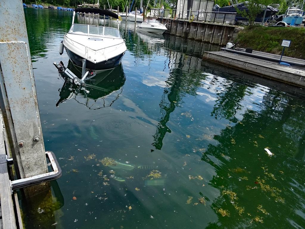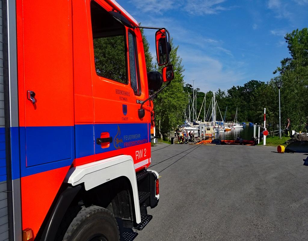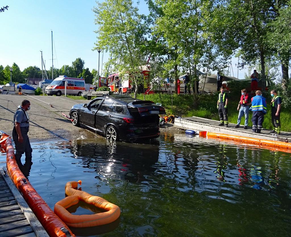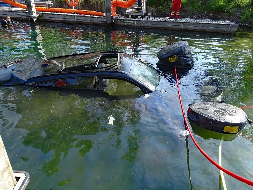 Deprecated: Function utf8_encode() is deprecated in /homepages/45/d16775473/htdocs/feuerwehr/html/einsaetze_show.html on line 146 Mit der Meldung „PKW im Wasser“ rückte die Feuerwehr Langenargen am Mittwochnachmittag in den BMK-Yachthafen aus. Der Fahrzeugführer des ersteintreffenden Löschfahrzeuges erkundete zunächst die Lage. Beim Auswassern rutschte ein Fahrzeug mitsamt Trailer und Boot in das Hafenbecken. Der erst fünf Monate alte SUV befand sich bei der Ankunft der Feuerwehr komplett unter Wasser, glücklicherweise befanden sich keine Personen in Gefahr. Zur Bergung wurden weitere Kräfte nachgefordert: Gerätewagen-Transport mit Ölsperrenanhänger der Feuerwehr Langenargen, Gerätewagen-Transport-Kran und Rüstwagen der Feuerwehr Friedrichshafen und Einsatztaucher der DLRG Bodensee. Um eine Wasserverschmutzung durch auslaufende Betriebsstoffe zu verhindern, wurden mithilfe eines Schlauchbootes vorsichtshalber Ölsperren ausgebracht und Ölschlängel eingesetzt. Einsatztaucher der DLRG hoben den PKW mit Luftsäcken an, sodass dieser mit der Seilwinde des Rüstwagens an Land gezogen werden konnte. Erst gegen 18:30 Uhr konnte auch der Einsatz im BMK-Hafen abgeschlossen werden. Weitere Einsatzkräfte: Feuerwehr Friedrichshafen mit RW und GW-T-Kran DLRG Bodensee Einsatztaucher Wasserschutzpolizei |